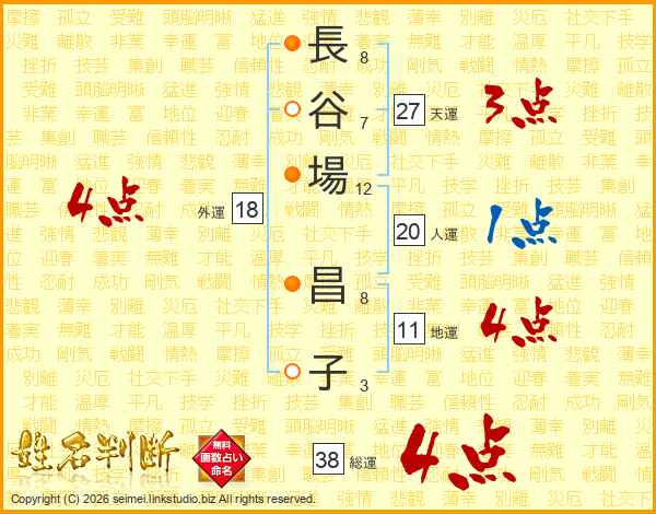 長(8画)谷(7画)場(12画) 昌(8画)子(3画)