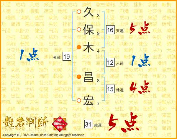 久(3画)保(9画)木(4画) 昌(8画)宏(7画)