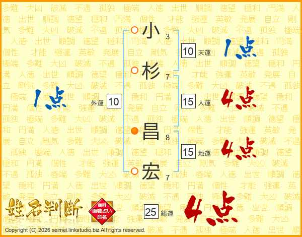 小杉昌宏さんの総運は25画の4点!