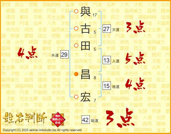 與(17画)古(5画)田(5画) 昌(8画)宏(7画)