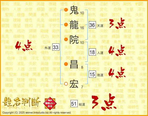 鬼(10画)龍(16画)院(10画) 昌(8画)宏(7画)