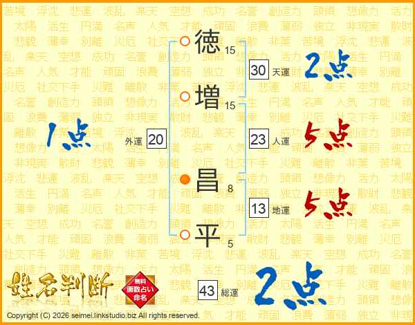 徳(15画)増(15画) 昌(8画)平(5画)
