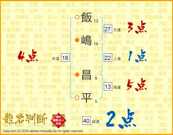 飯(13画)嶋(14画) 昌(8画)平(5画)