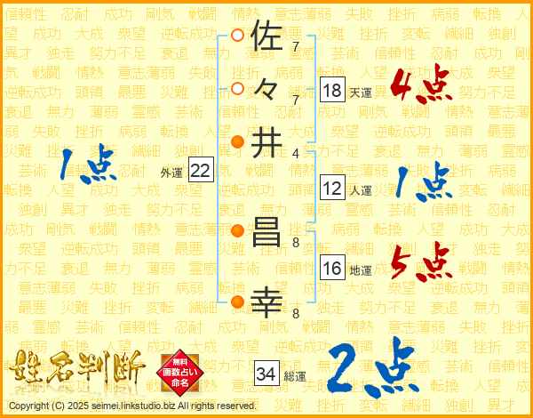 佐(7画)々(7画)井(4画) 昌(8画)幸(8画)
