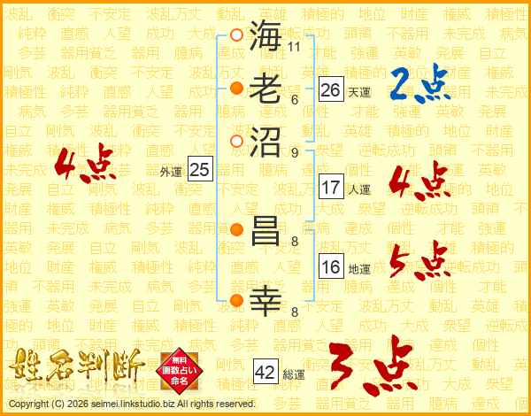 海(11画)老(6画)沼(9画) 昌(8画)幸(8画)