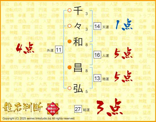 千(3画)々(3画)和(8画) 昌(8画)弘(5画)