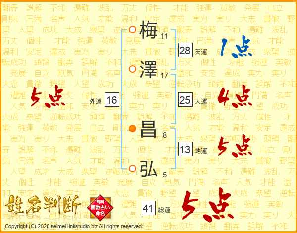 梅(11画)澤(17画) 昌(8画)弘(5画)