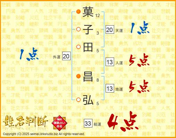 菓(12画)子(3画)田(5画) 昌(8画)弘(5画)