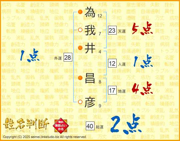 為(12画)我(7画)井(4画) 昌(8画)彦(9画)