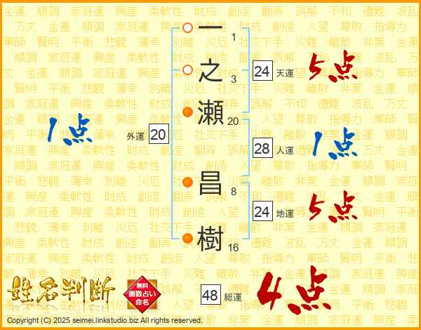 一(1画)之(3画)瀬(20画) 昌(8画)樹(16画)