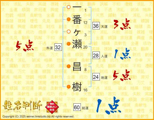 一番ヶ瀬昌樹さんの外運は32画の5点!
