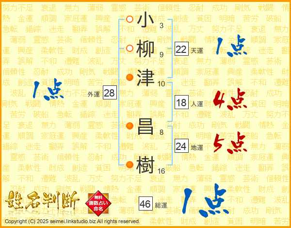 小(3画)柳(9画)津(10画) 昌(8画)樹(16画)