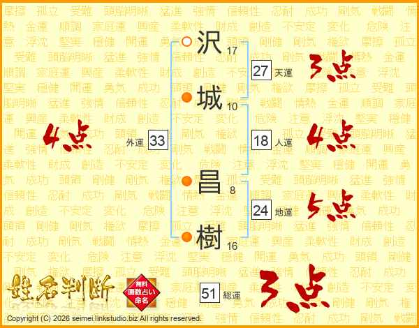 沢(17画)城(10画) 昌(8画)樹(16画)