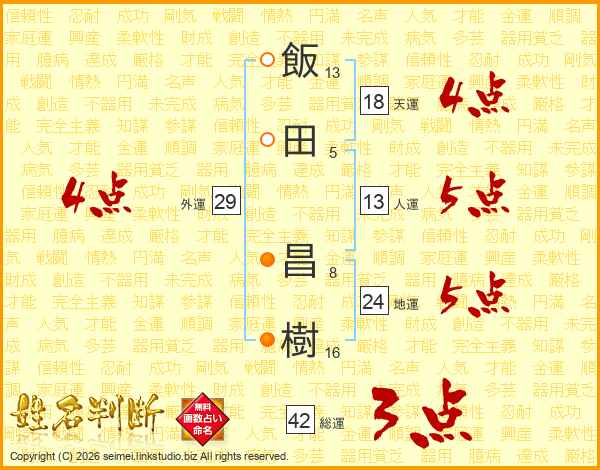 飯(13画)田(5画) 昌(8画)樹(16画)