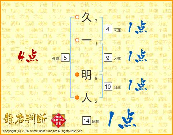 生活面を象徴する運勢です。外部から受ける影響力を表し、結婚運、家庭運や職場、環境への順応性を表します。総運から人運を引いた画数。姓や名が1文字の場合を除く。