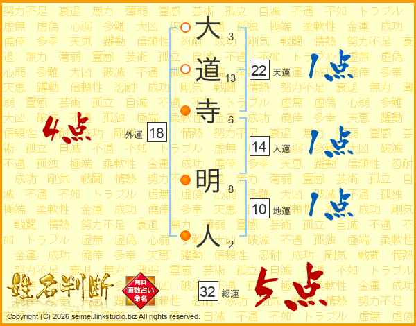 大(3画)道(13画)寺(6画) 明(8画)人(2画)