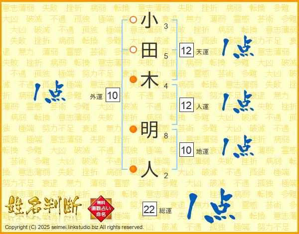 小(3画)田(5画)木(4画) 明(8画)人(2画)