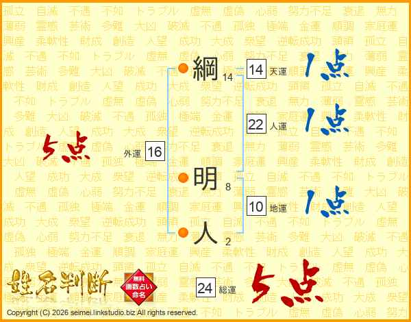 あなたの人生を表す1番重要な運勢です。生涯を通じて影響する総合運となり、主に50歳以降の晩年期に影響を及ぼします。苗字と名前の合計画数。
