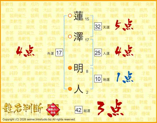 蓮(15画)澤(17画) 明(8画)人(2画)