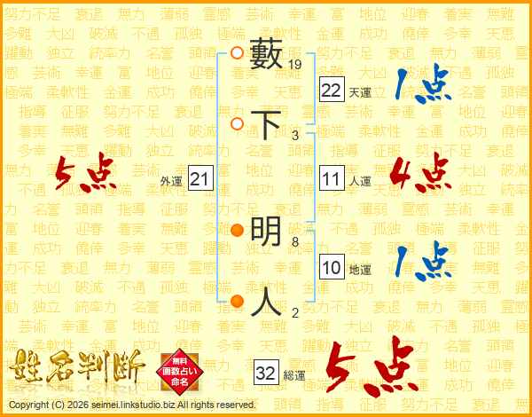 藪下明人さんの総運は32画の5点!