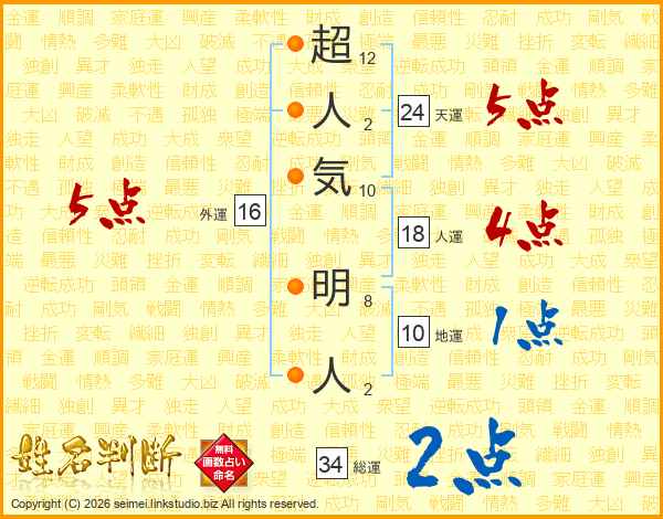 超人気明人さんの総運は34画の2点!