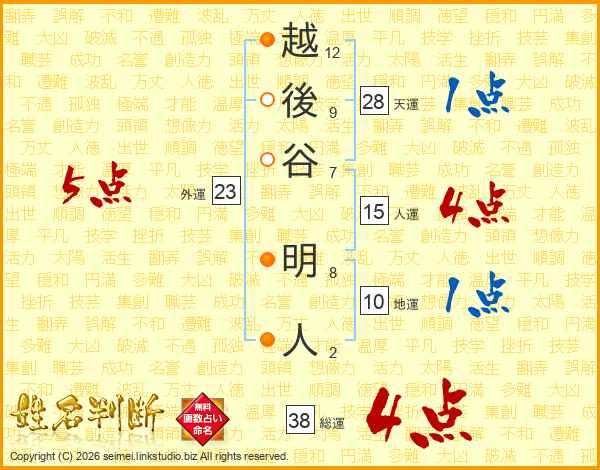 越(12画)後(9画)谷(7画) 明(8画)人(2画)