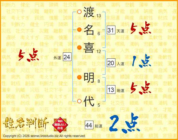 渡(13画)名(6画)喜(12画) 明(8画)代(5画)