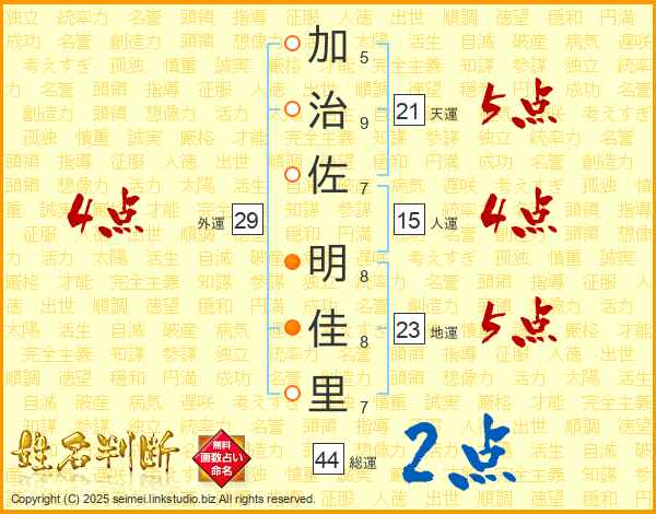 加(5画)治(9画)佐(7画) 明(8画)佳(8画)里(7画)
