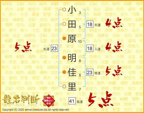 小(3画)田(5画)原(10画) 明(8画)佳(8画)里(7画)