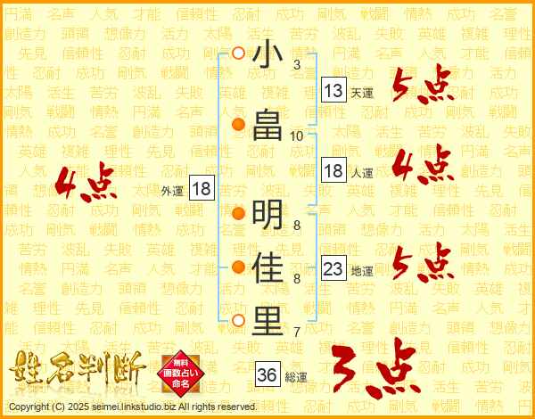 小(3画)畠(10画) 明(8画)佳(8画)里(7画)