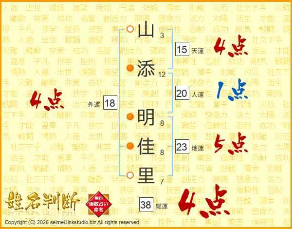 山(3画)添(12画) 明(8画)佳(8画)里(7画)