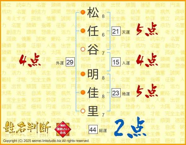 松(8画)任(6画)谷(7画) 明(8画)佳(8画)里(7画)