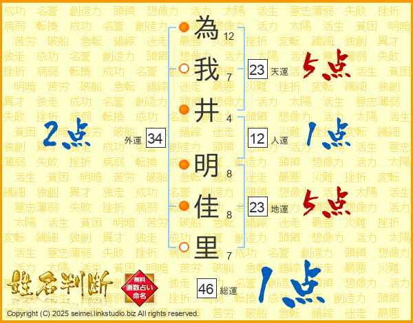 為(12画)我(7画)井(4画) 明(8画)佳(8画)里(7画)