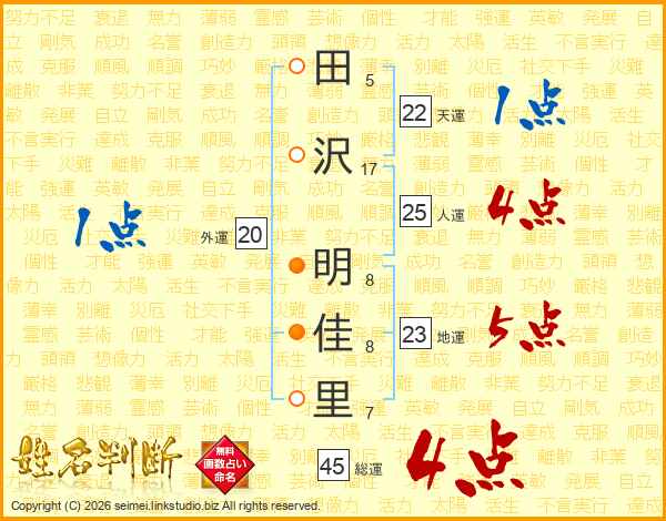 田(5画)沢(17画) 明(8画)佳(8画)里(7画)