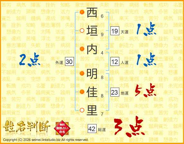 西(6画)垣(9画)内(4画) 明(8画)佳(8画)里(7画)
