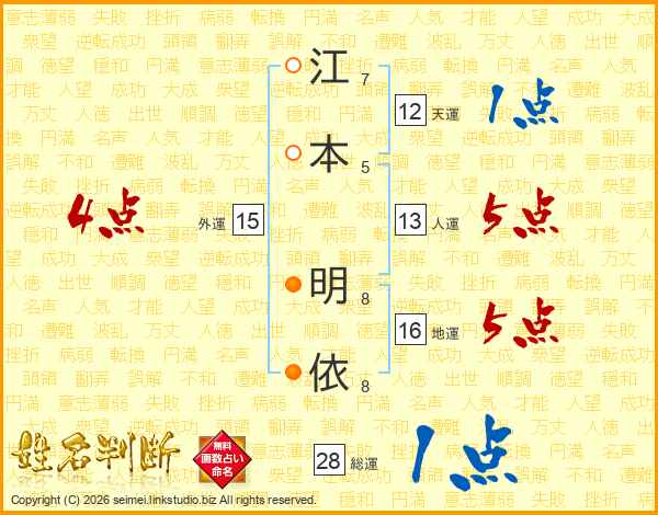 生活面を象徴する運勢です。外部から受ける影響力を表し、結婚運、家庭運や職場、環境への順応性を表します。総運から人運を引いた画数。姓や名が1文字の場合を除く。