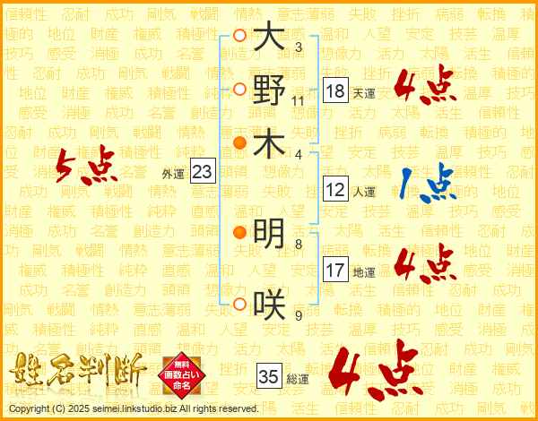 大(3画)野(11画)木(4画) 明(8画)咲(9画)