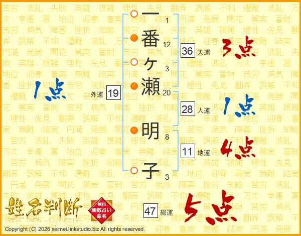 一(1画)番(12画)ヶ(3画)瀬(20画) 明(8画)子(3画)