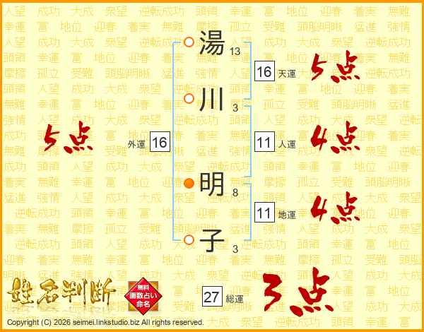 湯(13画)川(3画)  明(8画)子(3画)