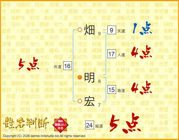 畑(9画) 明(8画)宏(7画)