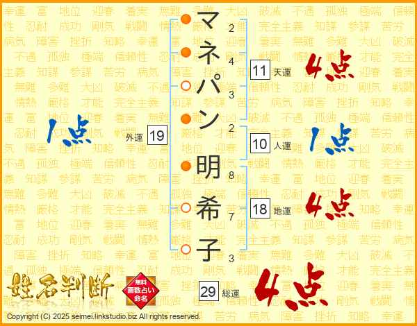 マ(2画)ネ(4画)パ(3画)ン(2画) 明(8画)希(7画)子(3画)