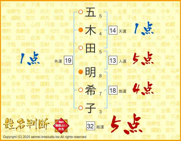 五(5画)木(4画)田(5画) 明(8画)希(7画)子(3画)