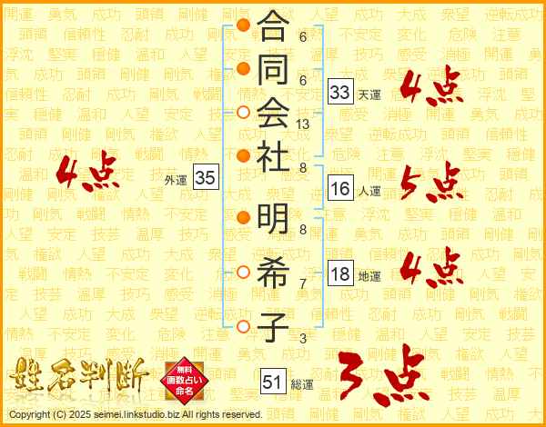 合(6画)同(6画)会(13画)社(8画) 明(8画)希(7画)子(3画)