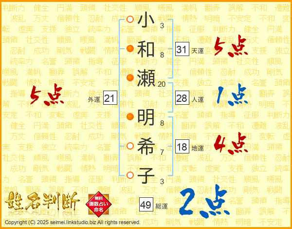 小(3画)和(8画)瀬(20画) 明(8画)希(7画)子(3画)