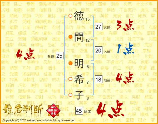 徳(15画)間(12画) 明(8画)希(7画)子(3画)