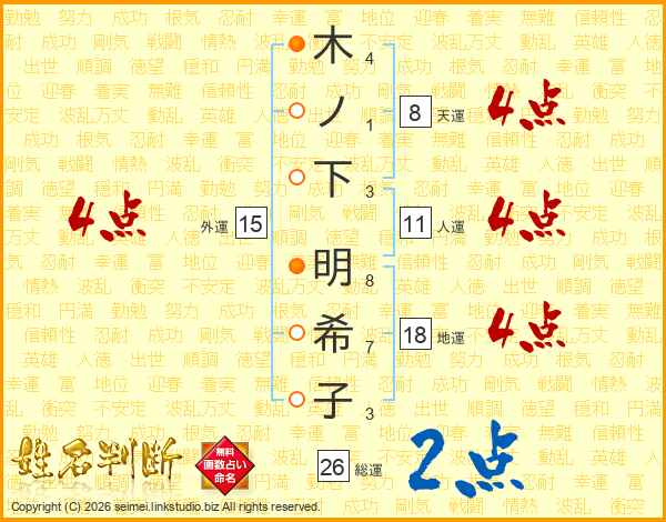 木(4画)ノ(1画)下(3画) 明(8画)希(7画)子(3画)