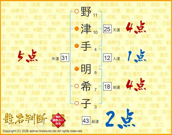 野(11画)津(10画)手(4画) 明(8画)希(7画)子(3画)