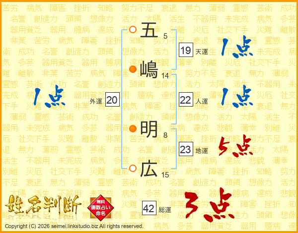 生活面を象徴する運勢です。外部から受ける影響力を表し、結婚運、家庭運や職場、環境への順応性を表します。総運から人運を引いた画数。姓や名が1文字の場合を除く。