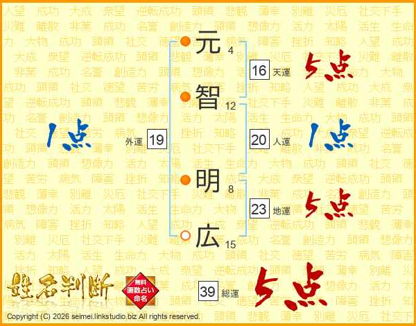 元(4画)智(12画) 明(8画)広(15画)