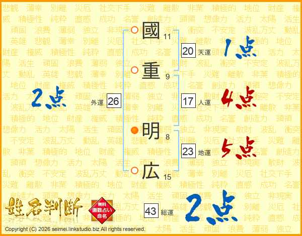 あなたの人生を表す1番重要な運勢です。生涯を通じて影響する総合運となり、主に50歳以降の晩年期に影響を及ぼします。苗字と名前の合計画数。